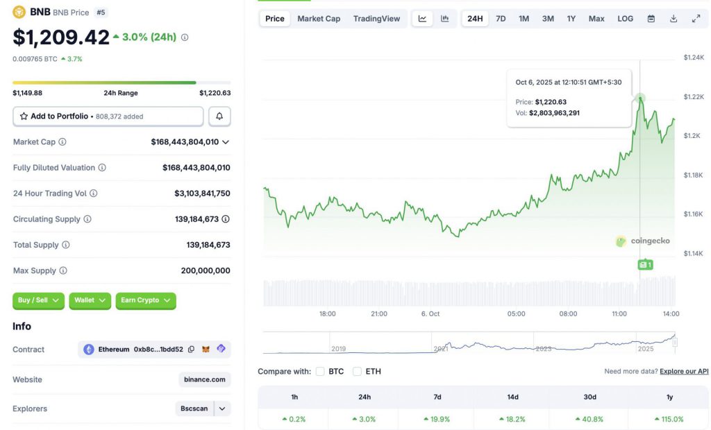 Binance’s BNB coin has had quite a ride in 2025. The popular crypto has hit multiple all-time highs over the last few months. BNB hit its most recent peak of $1220 earlier today. According to CoinGecko data, BNB is up 3% in the last 24 hours, 19.9% in the last week, 18.2% in the 14-day charts, and 40.8% over the previous month. BNB has far outshone the likes of Bitcoin (BTC), Ethereum (ETH), XRP, etc. BNB coin hitting a new all-time high has also led to a sharp increase in Binance founder CZ’s net worth.