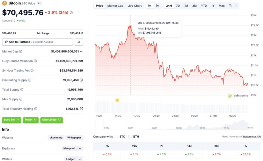 Bitcoin (BTC) climbed to $73,422 on March 5, 2026. However, the asset faced a rejection once again. BTC has made several attempts to breach past the $73,000 mark, but has not had any success. According to CoinGecko data, BTC’s price is up by 4.2% in the last week and 4.7% in the 14-day charts. However, the original crypto is down by 3.1% in the last 24 hours, 7.7% in the previous month, and 23.2% since March 2025. Let’s discuss why Bitcoin (BTC) faces rejection after every rally, and how it can reclaim the $90,000 price level.