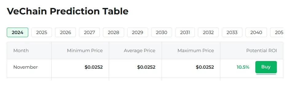 Leading on-chain metrics and price prediction firm Changelly has painted a rosy picture for VeChain’s native cryptocurrency, VET. According to the latest price prediction, VET is poised to surge double-digits in November 2024. The forecast indicates that VeChain could spike 10.5% by the end of next month.