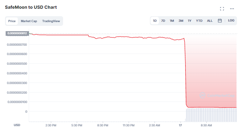 Per data from CoinMarketCap, SafeMoon was trading at $0.0000000812 a day back. Post the depreciation, the token’s price was on its knees at $0.000000003827, with an additional zero added.