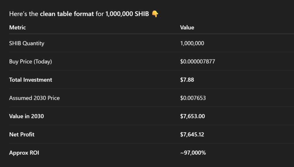 If one investor purchases 1M SHIB tokens at the current price of $0.000007877, then that investor may end up hitting a net profit of $7653 by 2030.