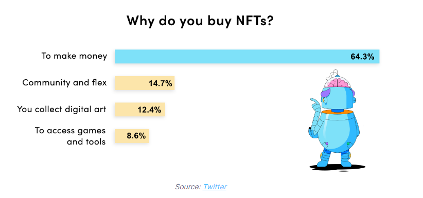 A recent survey conducted by DEXterlab revealed that close to 64% [of the 1318 respondents] indicated that they buy NFTs to make money. However, the remaining chunk of people prioritized other aspects.