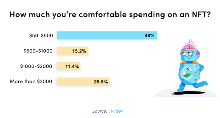 The survey also brought to light that half of the sample size wilfully spend $50-$500 to acquire an NFT. The next one-fourth revealed they were comfortable spending more than $2000 on a single non-fungible token. The remaining respondents indicated that their investment amount revolved in the $500-$20000 range.